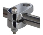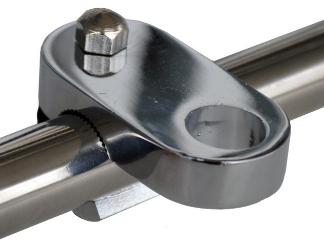 Lamp or single mount badge to badge bar adapter - will fit only 3/4" (19mm) dia. badge bars. Add a lamp or single mount badge to your badge bar with one of these clamp on adapters. Heavy chrome plate and split apart construction make this an ideal clamp to use on bars were you can not get access from an end. This item was a Desmo design back in the 60s. Shown fitted to a badge bar which is not included. Hole for lamp or badge is 15.60mm (0.61") diameter.