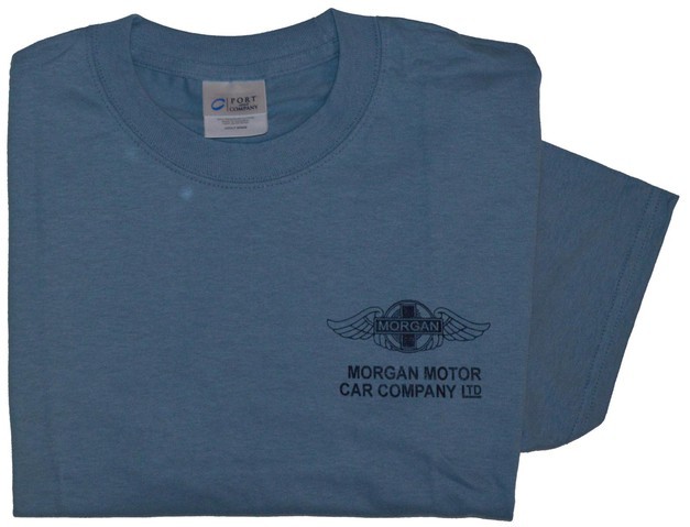 PLEASE NOTE SIZE LARGE & X.LARGE OUT OF STOCK T-Shirt - Morgan Wings small size design. Printed on a 100% cotton heavy weight t-shirt. Current colour combination is stone wash blue t-shirt with navy blue logo. Please note Morgan logo is licensed to Triple-C by Morgan Car Company through LMI.